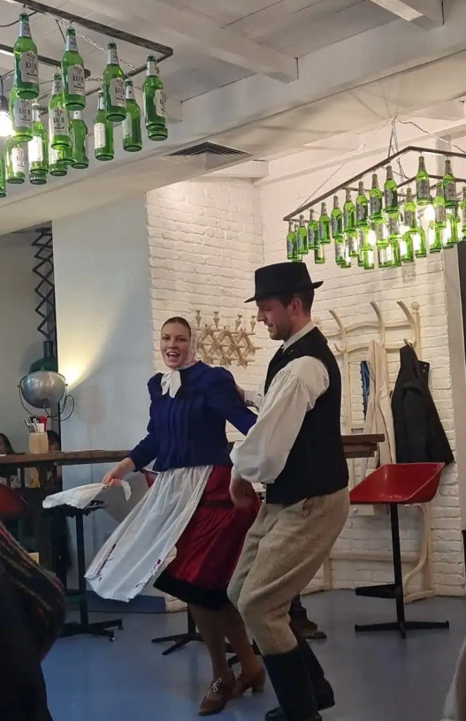 The restaurant showcases large tanks in which beer is brewed so, among the other decorations, this contributes to its unique vibe. At some point we noticed a couple dressed in traditional Hungarian clothes who started singing and dancing to entertain the customers. A nice surprise to watch a traditional dance show whilst dining.