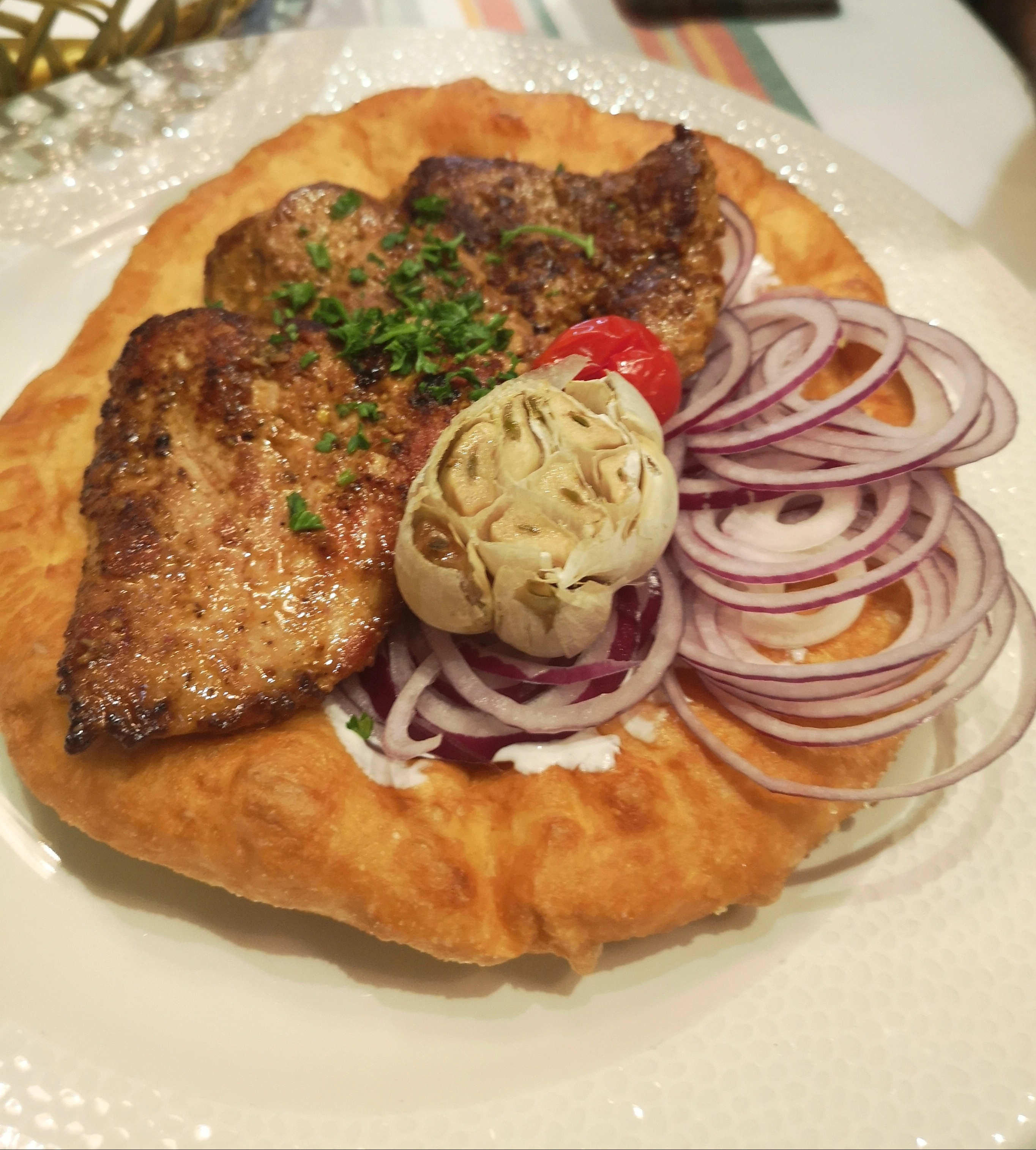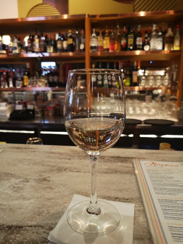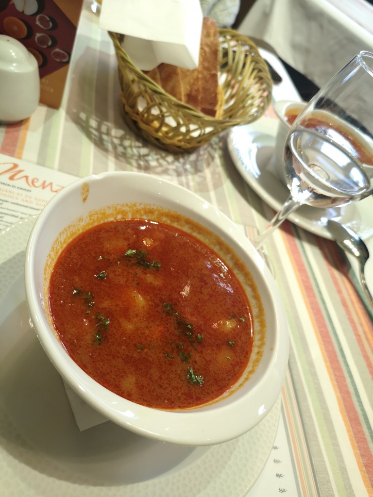 Not even 15 minutes passed and the waiter invited us to sit at a table. The food was incredibly tasty – we both served a traditional goulash soup and shared a main course, more precisely pork medallions with mustard and traditional Hungarian fried bread with sour cream. Everything was excellent, from the food, to the service, the decorations and atmosphere.